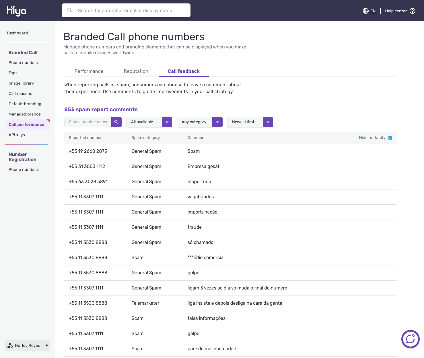 To view the list of spam report comments, go to "Call performance" under the Branded Call section. Then click the "Call feedback" tab.