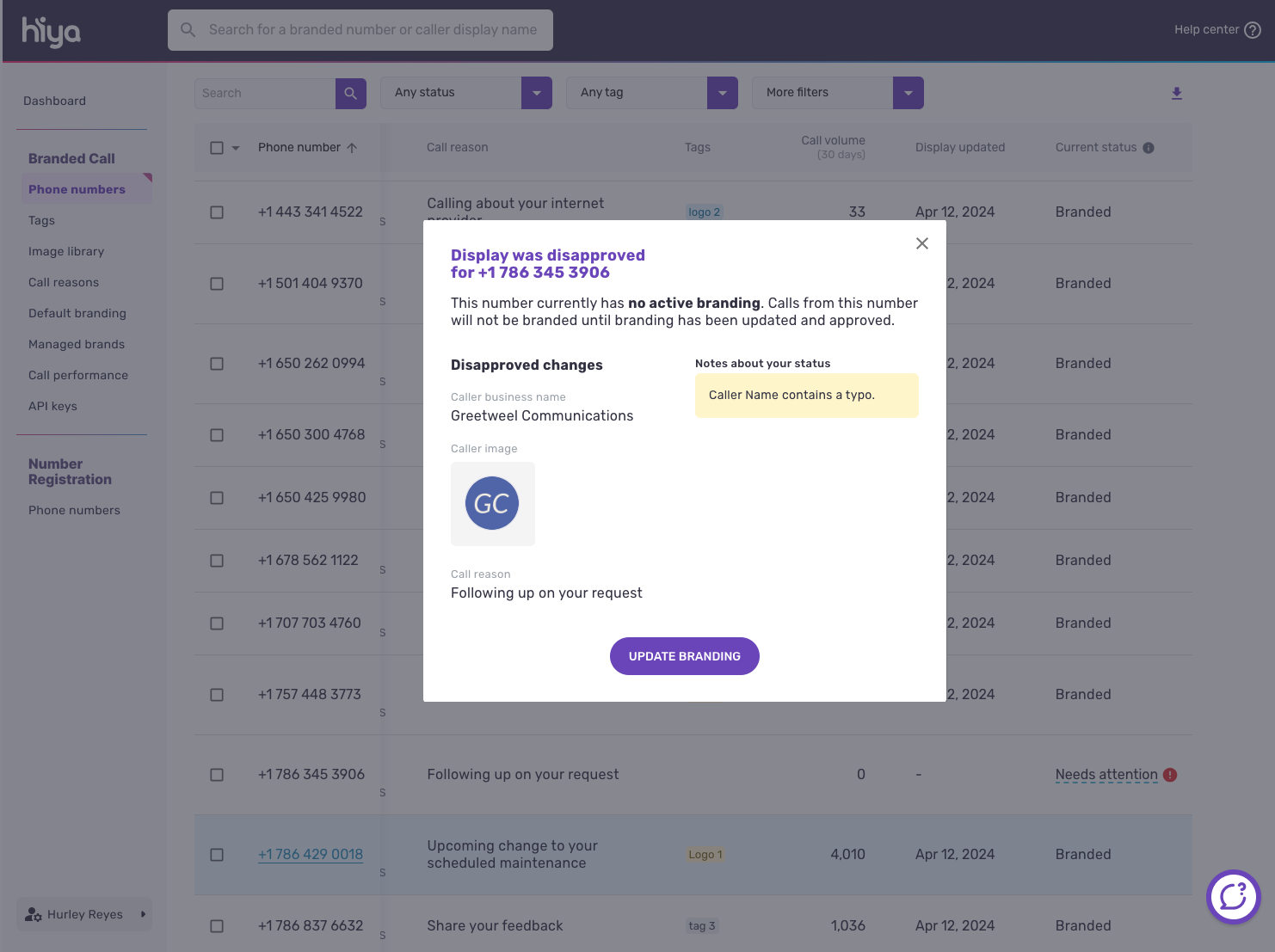Needs attention: Phone numbers for which one or more branding elements have been disapproved. Any active branding has not been changed. Refer to the reason for the disapproval and Branded Call Requirements and Guidelines, and take action to re-enable the branding.