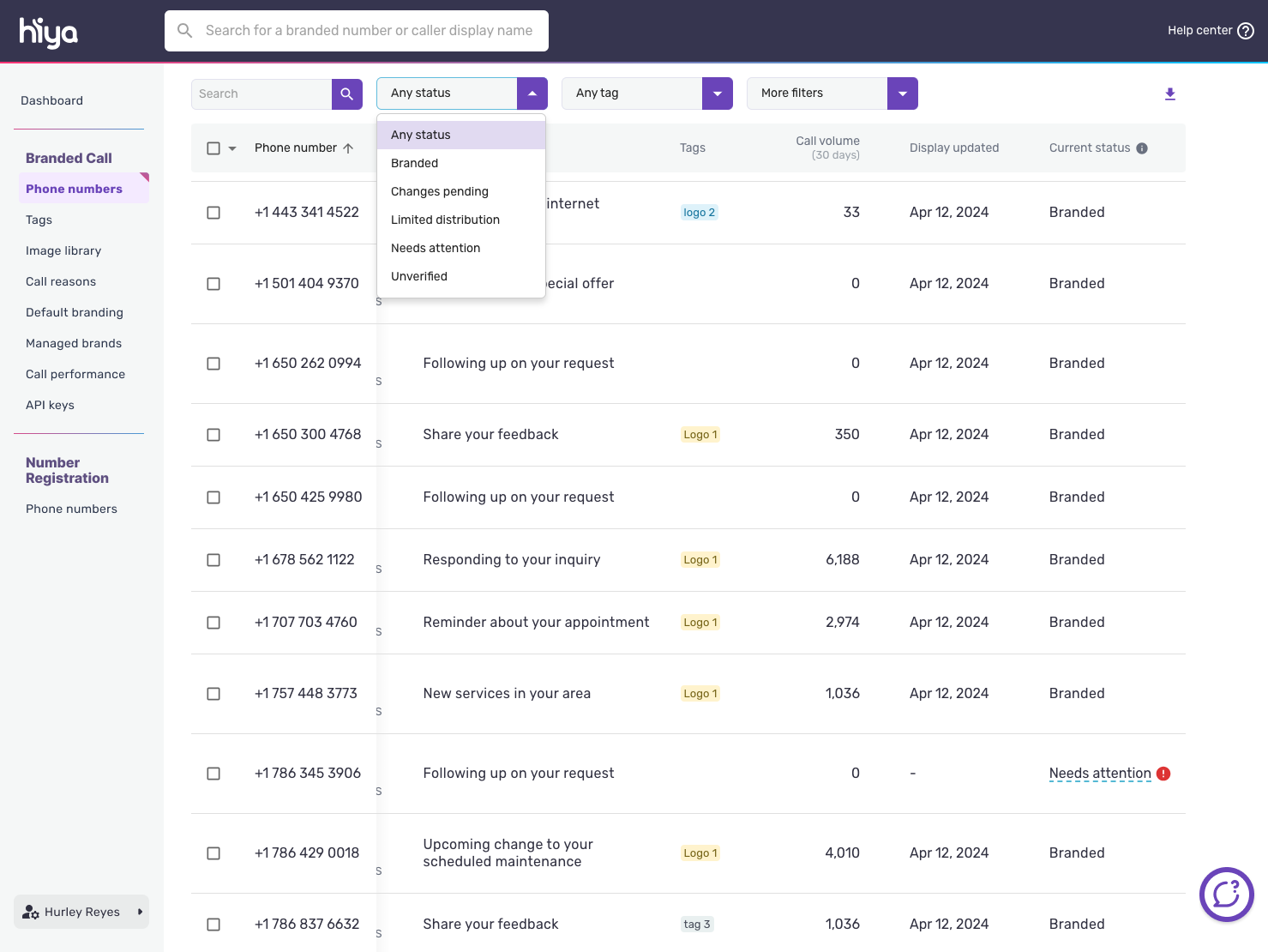 The branding status is listed in the “Current status” column on the phone numbers page under the Branded Call section.