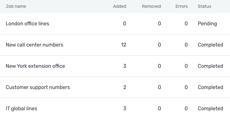 - Provide a job name for this upload. The job name is an internal label that makes it easier for you to reference and categorize your phone numbers in the console. It is strongly recommended to choose a job name that reflects the type of phone numbers included in your upload; for example, “Tampa office desk phones”, or “Call center lines”.