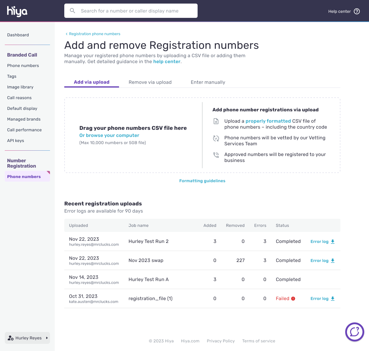 A business can register phone numbers under the Number Registration section of the console. Hiya recommends registering all phone numbers in use by your business, regardless of the purpose of their phone calls. Phone numbers can either be registered via uploading a file or by entering them manually.