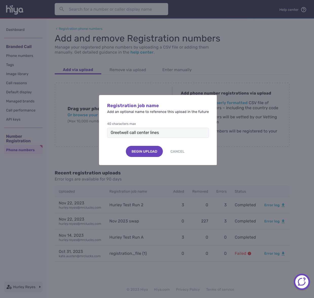 - Click “Begin upload” to start the upload and registration process.