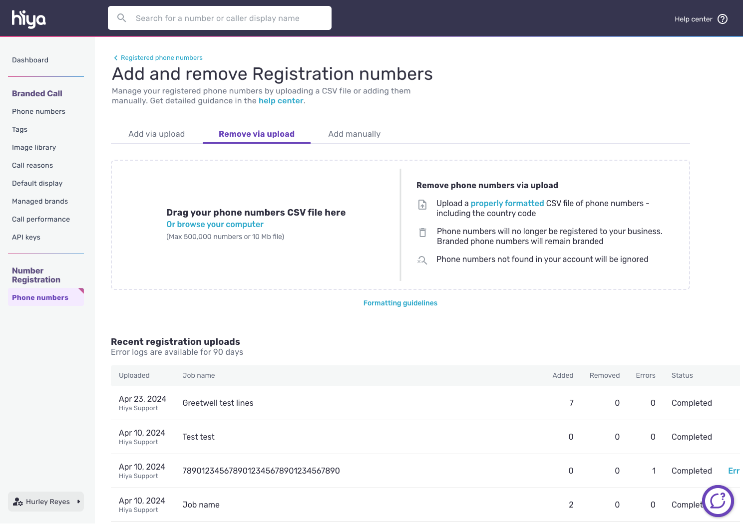 It is strongly recommended that the list of phone numbers be kept current and accurate at all times. If a phone number is no longer in use by your business, there are two methods to remove it: From the list of phone numbers or as a batch file of all numbers to be removed. Removed phone numbers will no longer be registered to your business. However, if the removed numbers are branded, the numbers will remain branded.