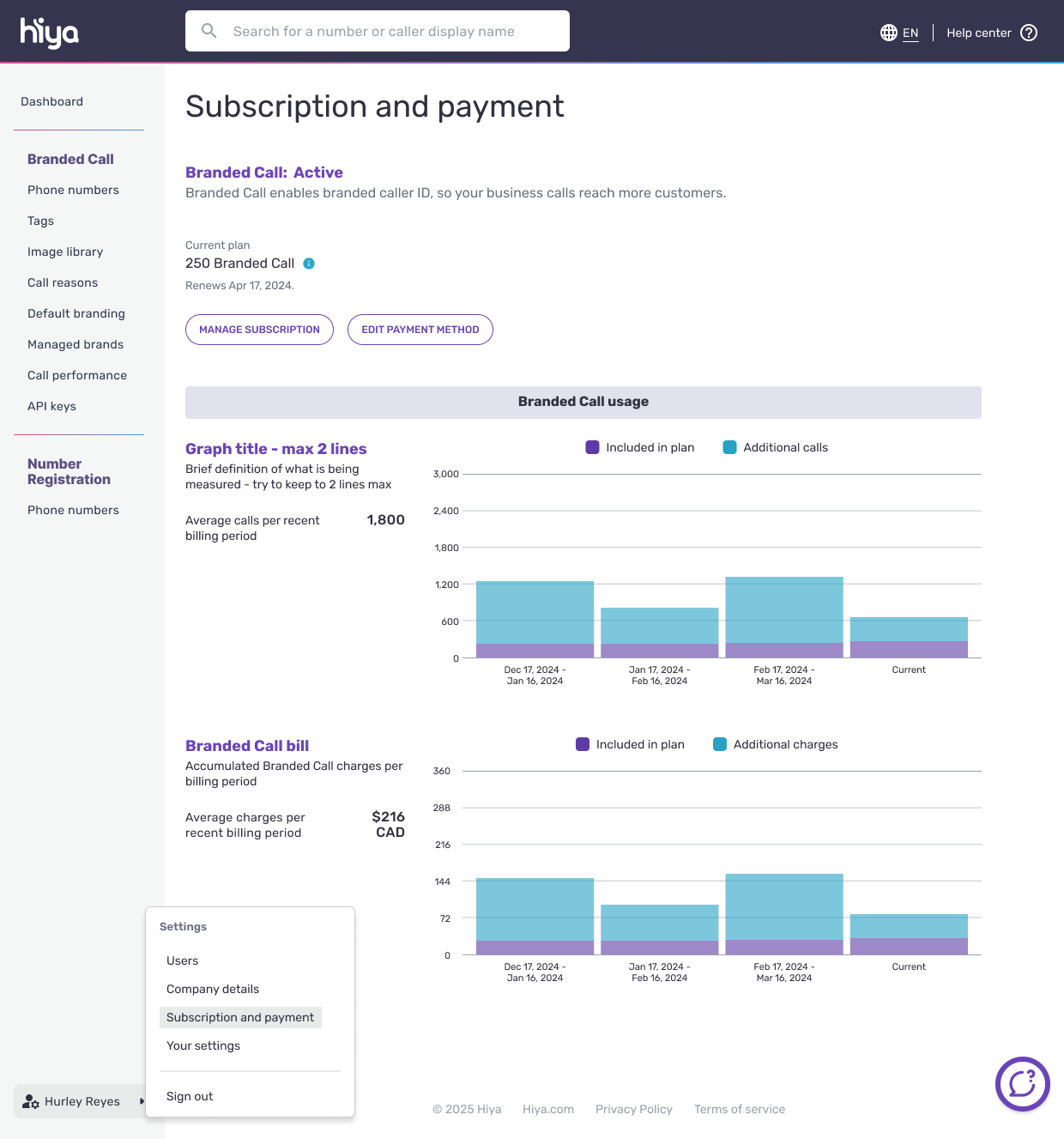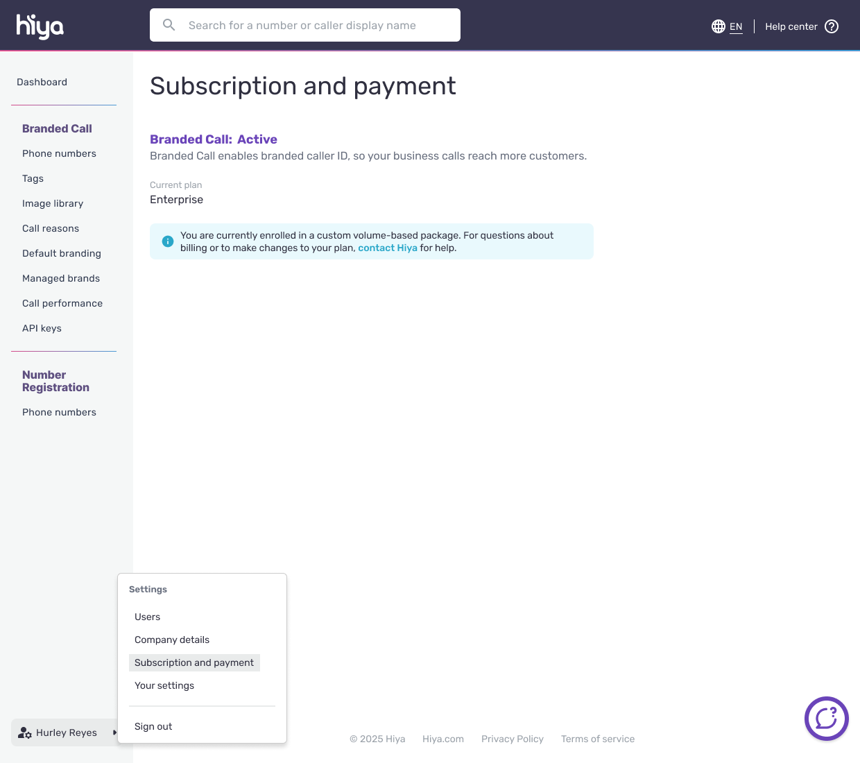 If a user subscribes to the Enterprise plan, the user is not allowed to manage the subscription or find Branded Call usage in the console. For questions about billing or to make changes to the Enterprise plan, contact Hiya for help.