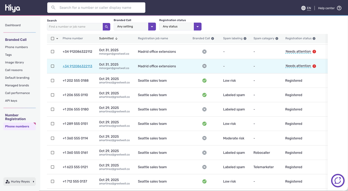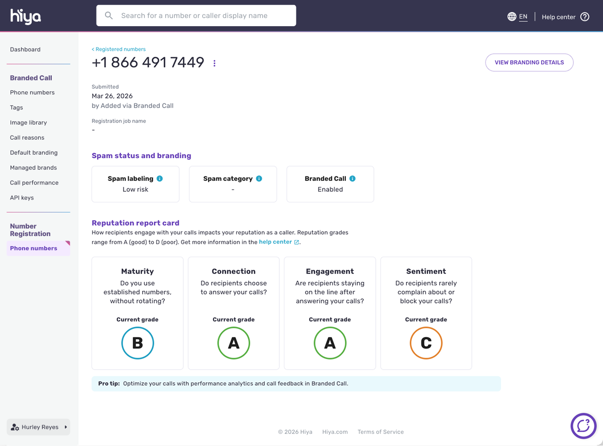 Hiya Caller Reputation — included automatically for customers within Hiya Connect Number Registration — enables businesses to see their spam status and a reputation report card. Read on to understand how these features work.