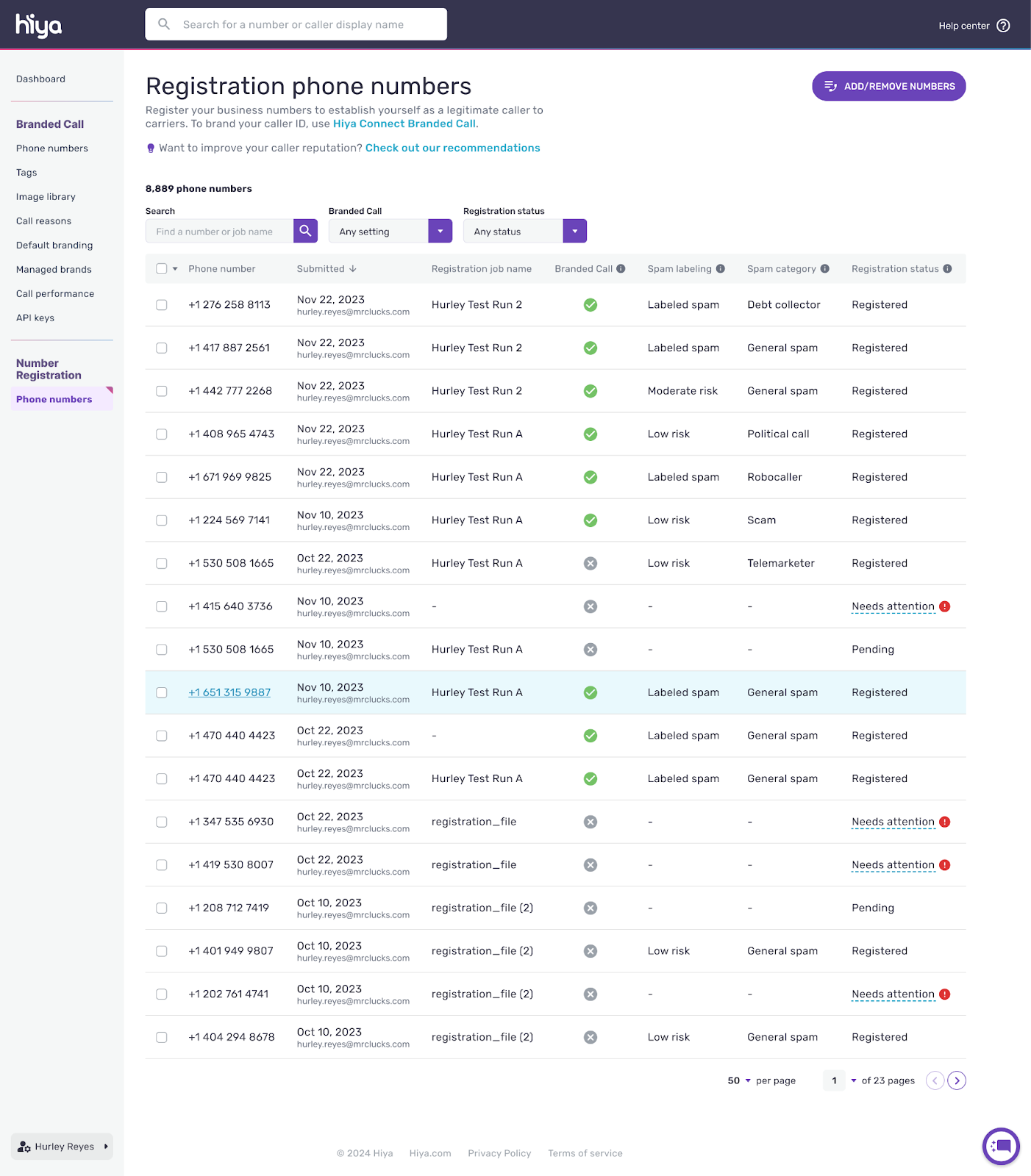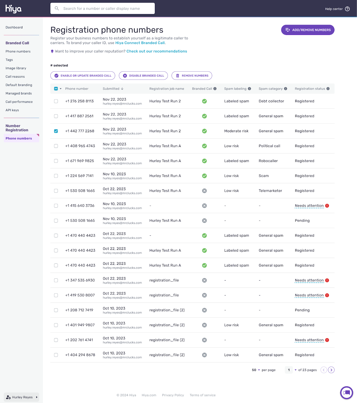 - Click on the checkbox next to the phone number(s) you wish to enable/disable call branding. You can use the filter features to find the phone numbers.
