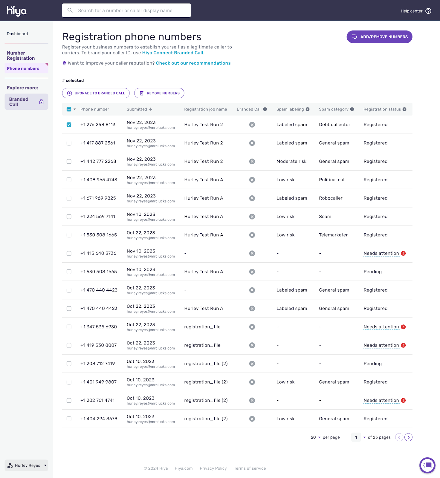 The phone numbers with branding will show a checkmark in the “Branded Call” column.