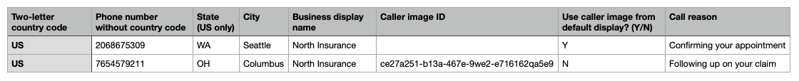 Your list of phone numbers with any Call Branding details you’d like to apply
