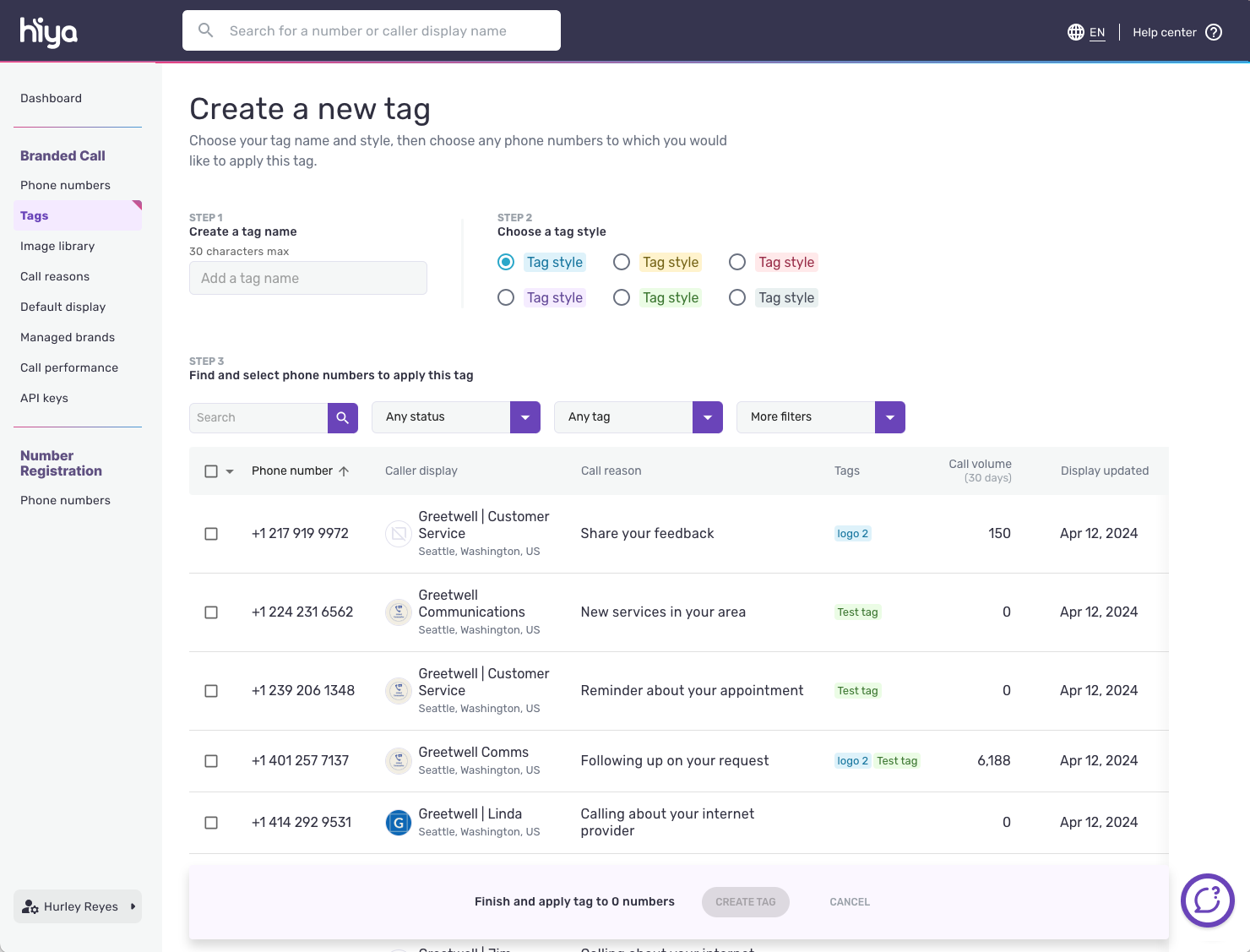 Click the “Tags” in the navigation pane on the left, which can be found under the Branded Call section, and click on the “Create new tag” button. You will be able to enter the tag name and choose its style from 6 tag colors. You can associate phone numbers to the tag (optional). You can associate phone numbers with the tag after you created a tag by editing a tag.