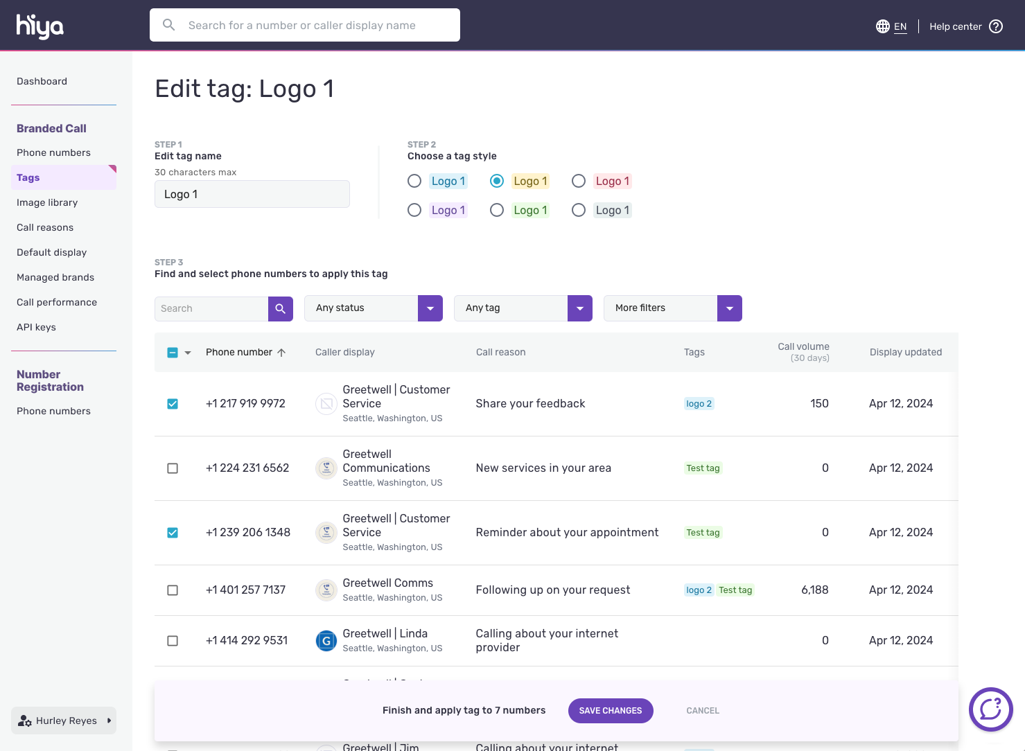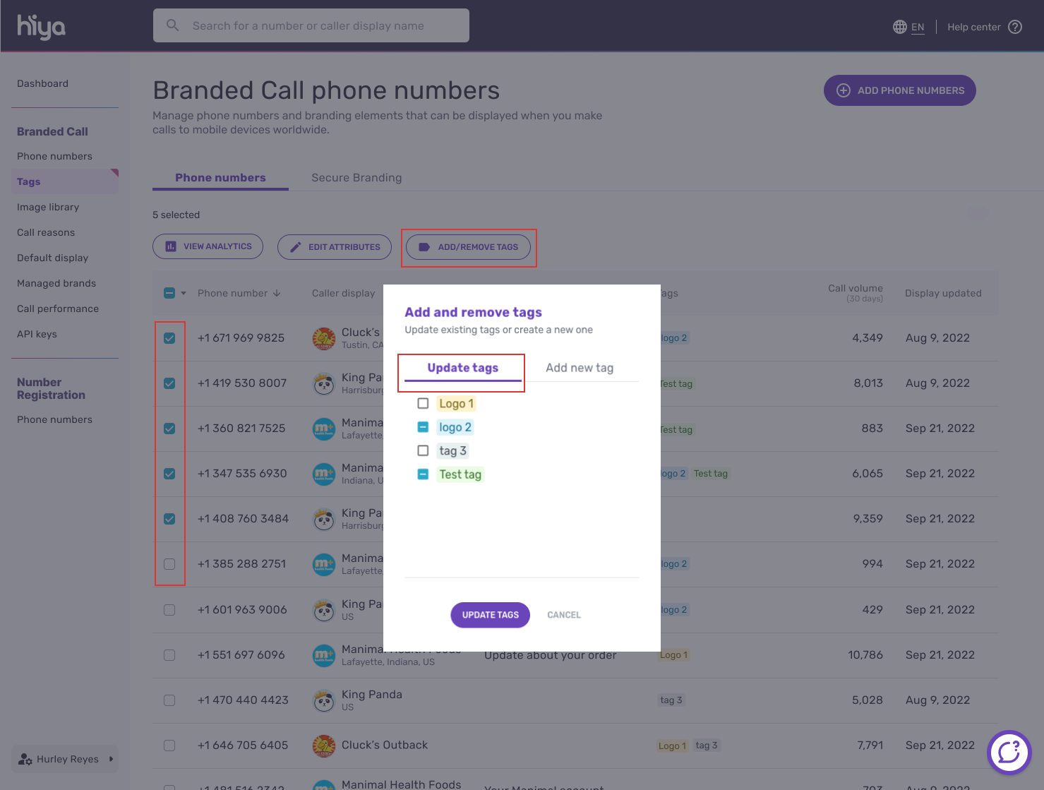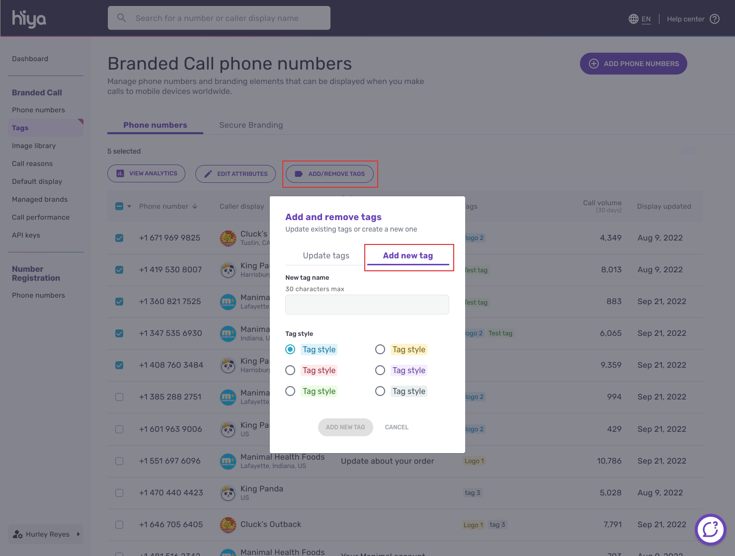 Click on one or more checkboxes in your list of phone numbers in Branded Call phone numbers. At the top of the list, click on the “Add/Remove tags” button. In the pop-up window that appears, select the “Add new tag” tab and enter a tag name and style. Clicking the “Add new tag” button at the bottom will apply that tag to all selected phone numbers.
