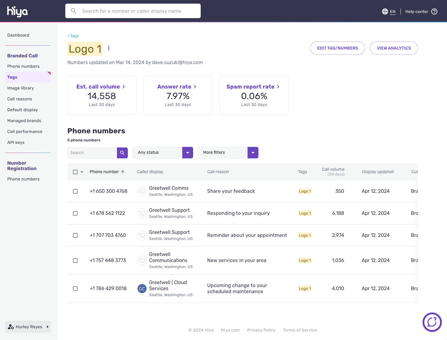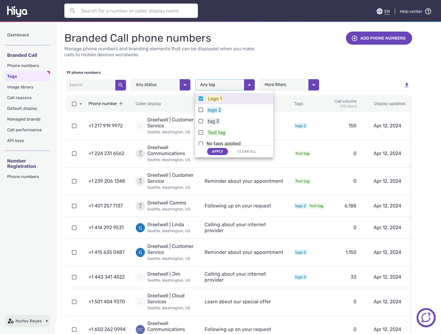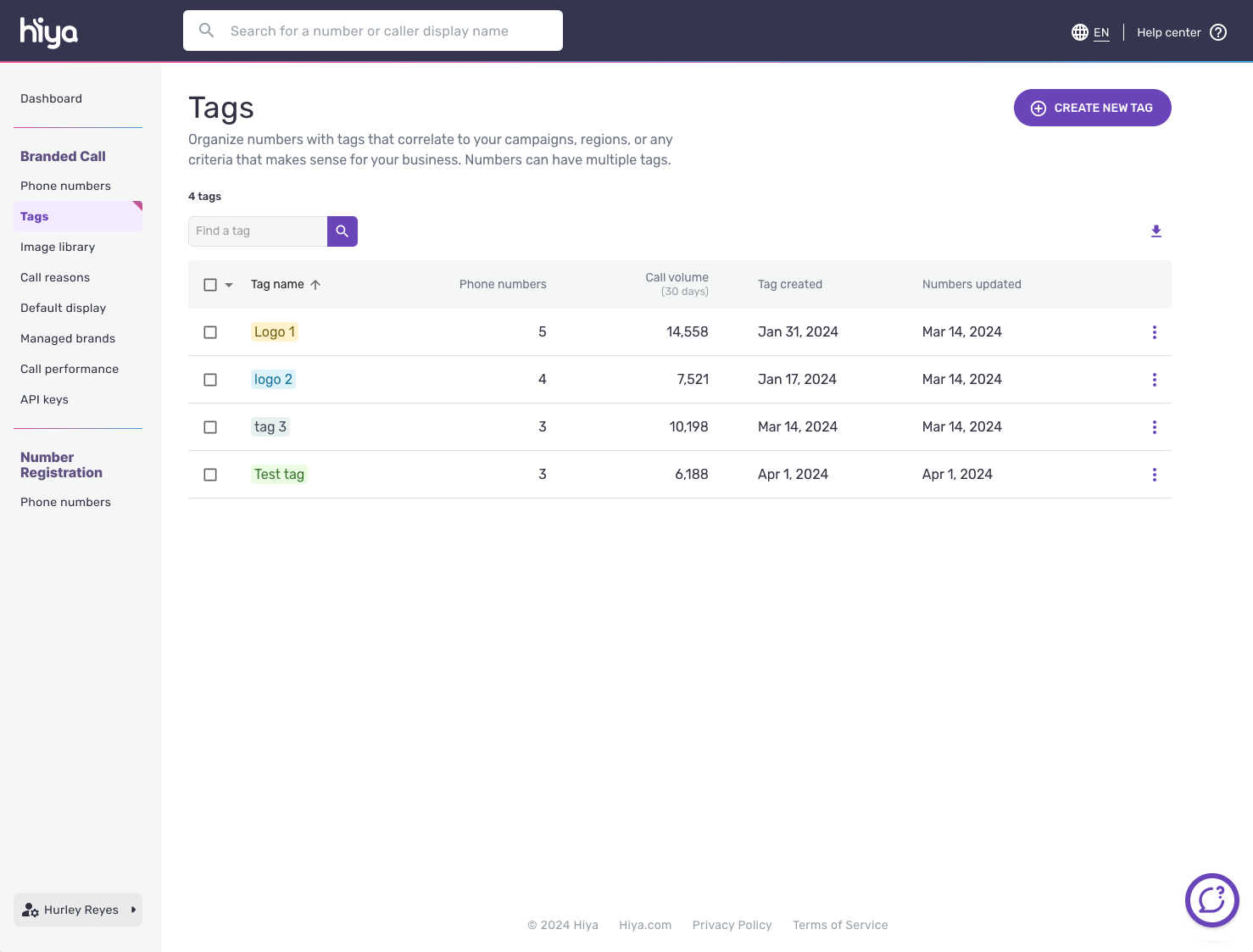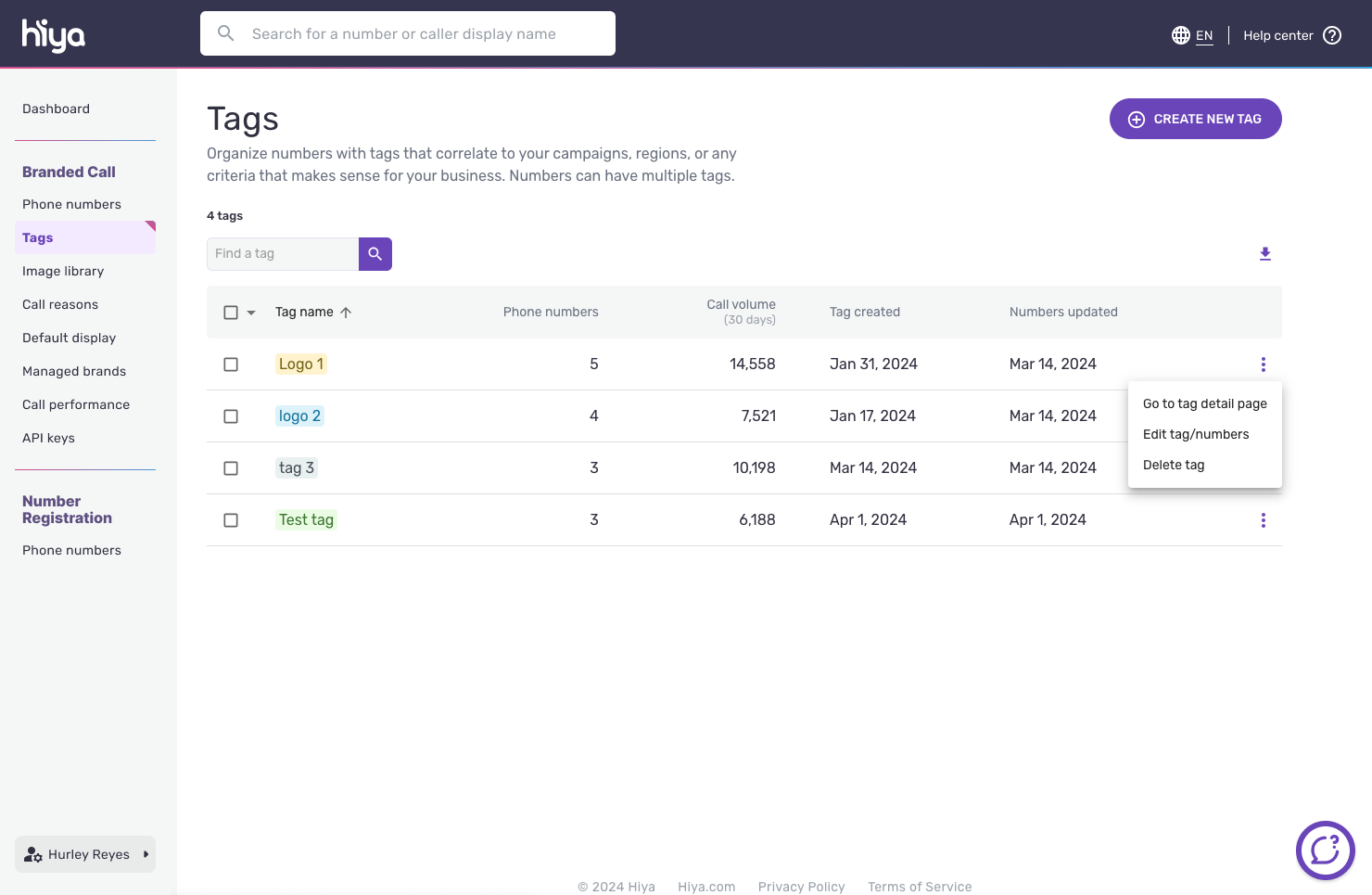 On Branded Call, applying tags is a way to organize and analyze groups of phone numbers. Using tags allows you to manage and edit phone numbers in customized groups.