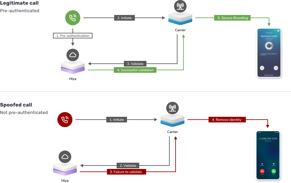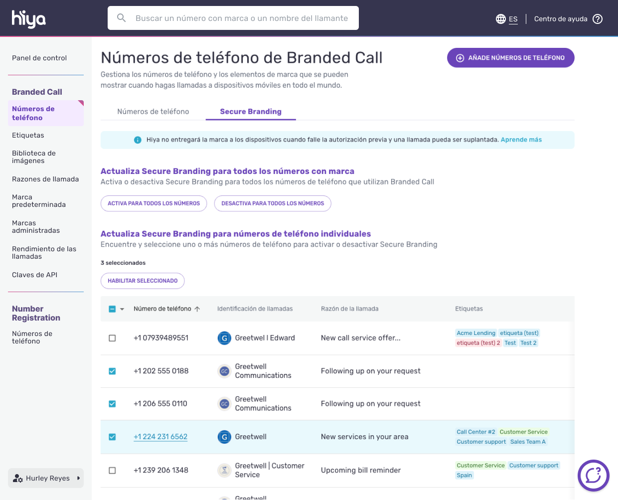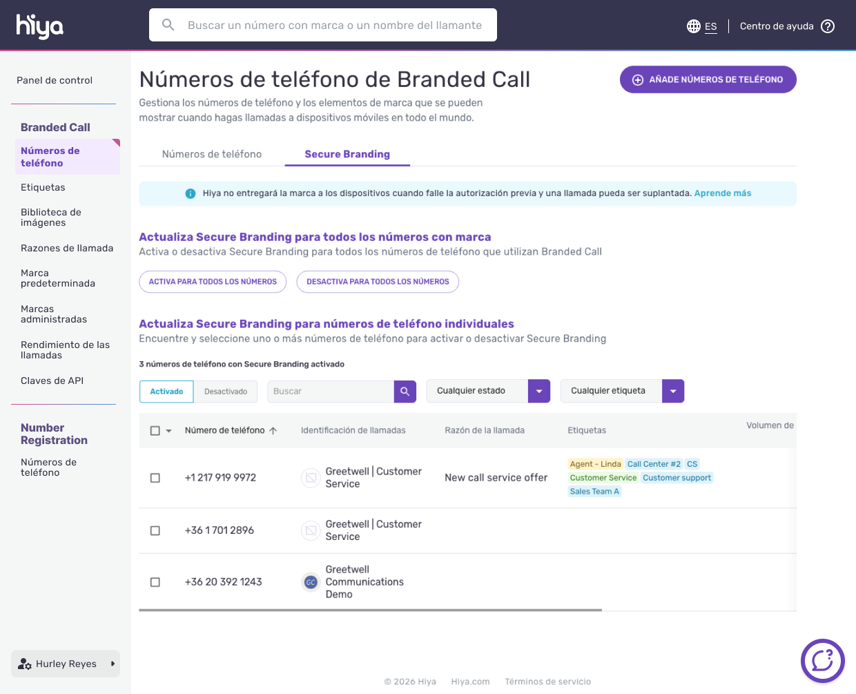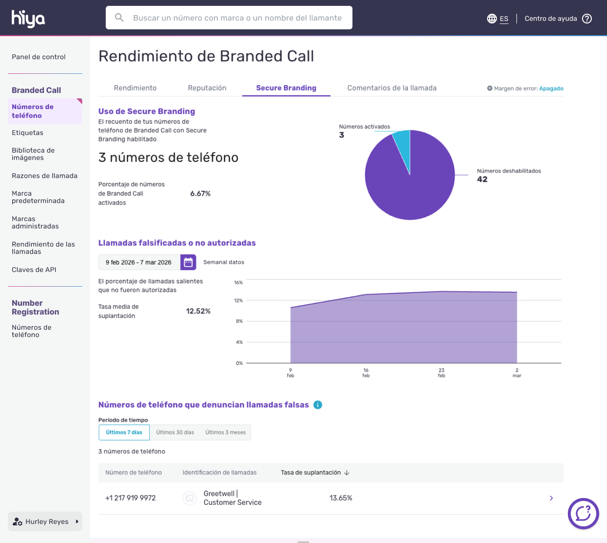 Cuando Secure Branding está activada en tu cuenta, un filtro antifraude autentica previamente las llamadas salientes. Cualquier llamada no autorizada puede perder su identidad. Secure Branding gestiona cualquier actividad no autorizada en las llamadas que terminan en la red de Hiya.